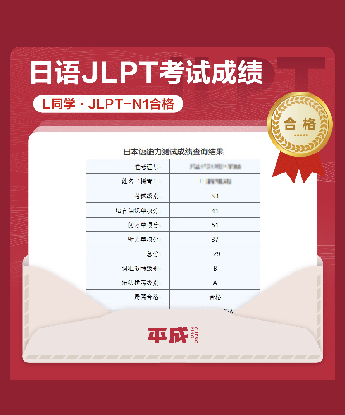 L同学在2025年8月的JLPT考试中获取129分